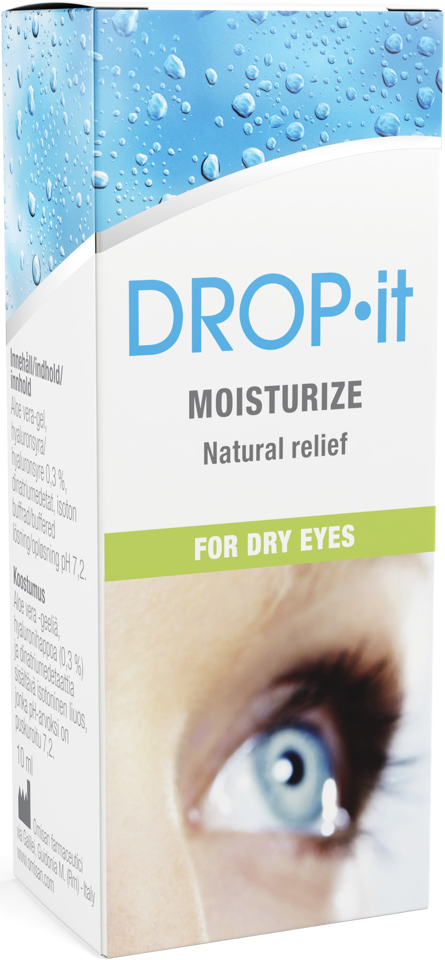 DROP-it Moisturize Ögondroppar för torra ögon är återfuktande, smörjande och fuktgivande lösning med aloe vera och natriumhyaluronat. Dropparna bidrar till att lindra torra ögon på grund av överdriven exponering för torr luft, solljus, vind och föroreningar.