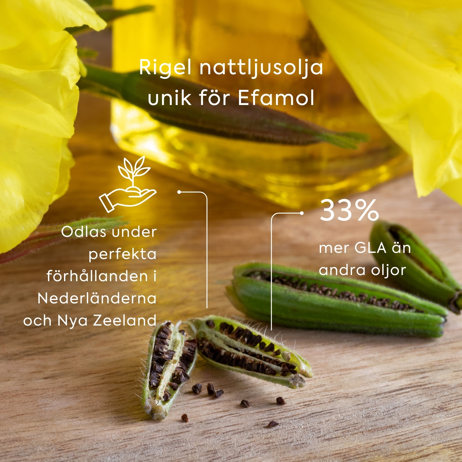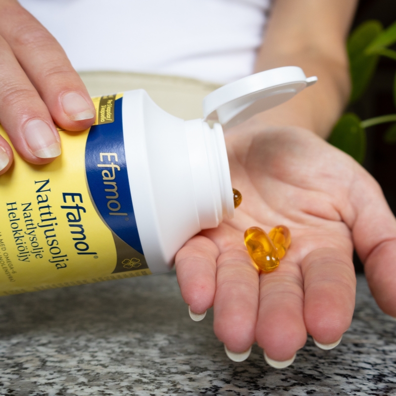 Efamol är ett kosttillskott som innehåller nattljusolja med hög halt av fleromättade Omega-6-fettsyror samt vitamin E som antioxidant för att skydda fettsyrorna. Efamol är extra rik på gammalinolensyra, GLA. Nattljusolja bidrar till en hälsosam hud och den hormonella balansen. Efamol innehåller också vitamin E som bidrar till att skydda cellerna mot oxidativ stress.